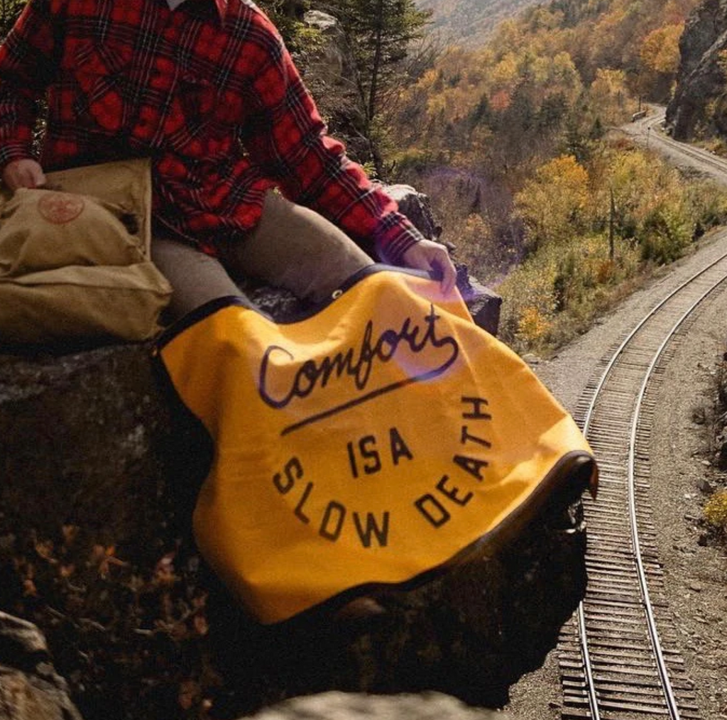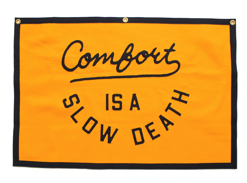 Don't get too comfortable. This Comfort is a Slow Death championship banner flag features hand-stitched felt lettering and a design by Mark Richardson.