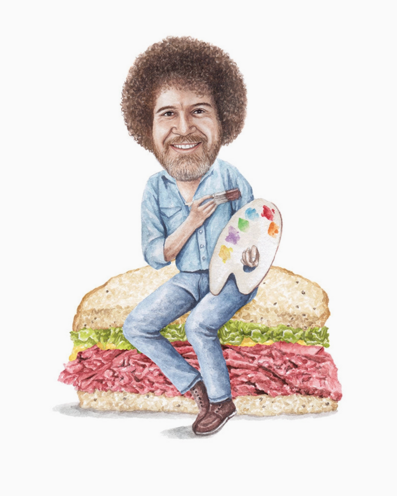 Watercolor print of Bob Ross on a pastrami, lettuce, and yellow mustard on rye.