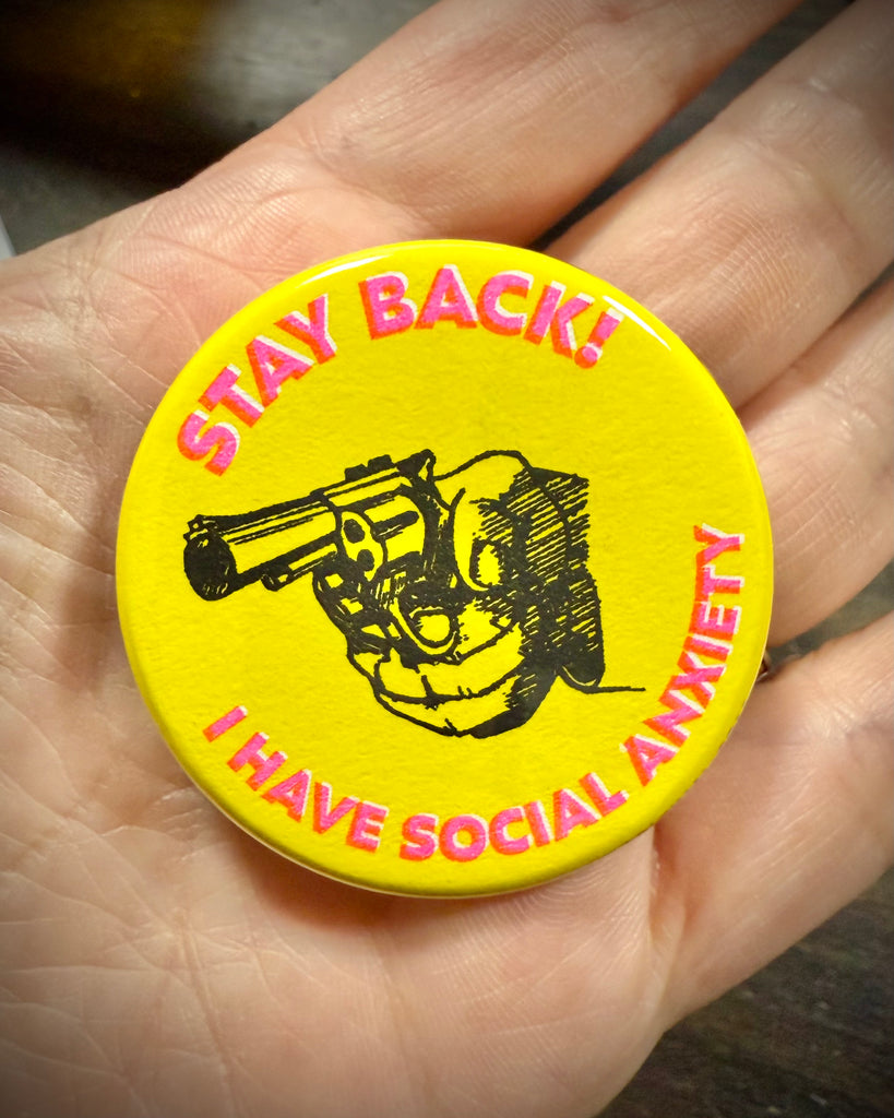 Bright fluorescent pink and federal blue riso print. The enamel pin killed the 1" button... But the 1.75" button lives on! ... Or whatever. Riso printed in the USA by risolve Pressed in the USA by World Famous.