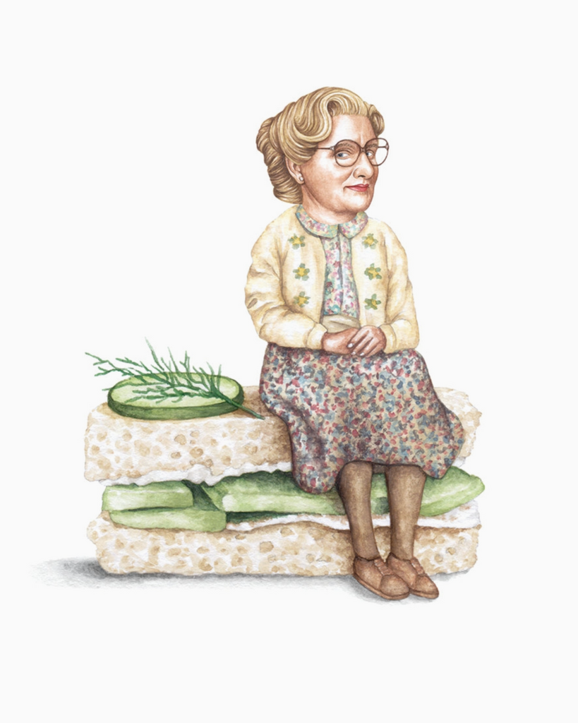 Watercolor print of Robin Williams as Mrs. Doubtfire on an English cucumber tea sandwich